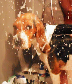 Für eine Party muss Wauzel sich auch hübsch machen...! Franzis Patschnassbild ist unter Zwang und Protest entstanden und eigentlich mehr Schaum als Patsch. Aber Nass ist nass! Und hübsch sah sie danach bestimmt aus!